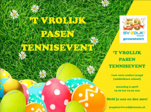 18 enthousiaste tieners in combinatie met kou, wind, regen en zelfs sneeuw maakten van ’t Vrolijk Pasen Tennisevent op 2e paasdag een uniek en veelzijdig evenement. De oudere jeugd vermaakte zich prima tijdens vier rondes tenniswedstrijden.