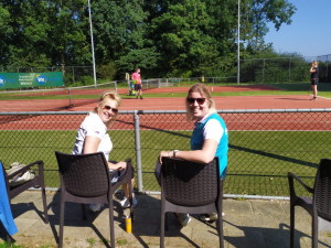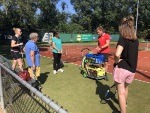 Om 14.00 uur kwamen vier dames die zich hadden opgegeven voor deze proefles. De een had 20 jaar geleden haar laatste balletje geslagen, de ander woont sinds kort hier in de Odijk en wil graag kijken of tennis iets voor haar is. Er waren zelfs een moeder en dochter die het samen wilden proberen.