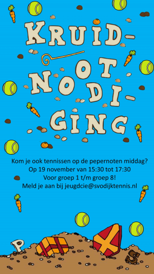 De jeugdcommissie organiseert op vrijdag 19 november aanstaande van 15.30 - 17.30 uur een gezellige pepernoten tennismiddag. Deze middag is voor alle jeugdspelers van groep 1 tot en met groep 8. Leuk als je meedoet! Meld je aan via jeugdcie@svodijktennis.nl